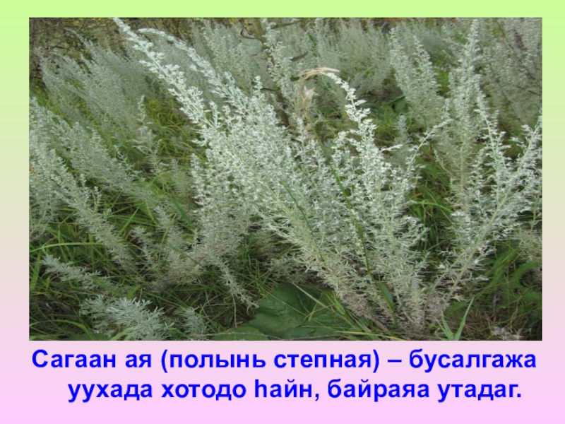 Слайд 3Сагаан ая (полынь степная) – бусалгажа уухада хотодо hайн, байраяа утадаг.