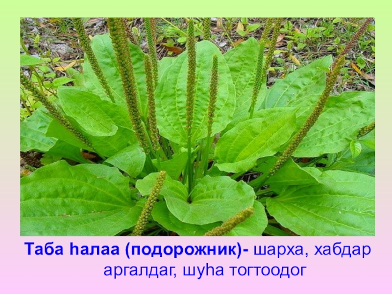 Слайд 4Таба hалаа (подорожник)- шарха, хабдар аргалдаг, шуhа тогтоодог