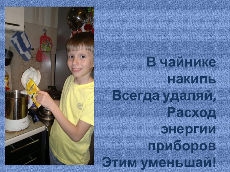 В чайнике накипь Всегда удаляй,Расход энергии приборов Этим уменьшай!