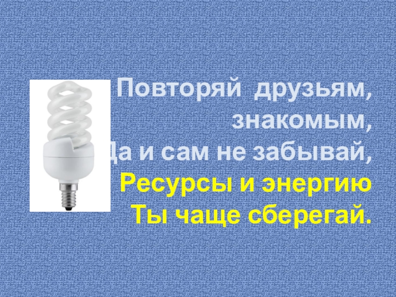 Повторяй друзьям, знакомым,Да и сам не забывай,Ресурсы и энергиюТы чаще сберегай.