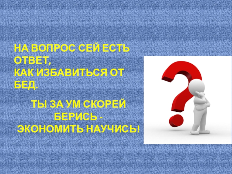 НА ВОПРОС СЕЙ ЕСТЬ ОТВЕТ,КАК ИЗБАВИТЬСЯ ОТ БЕД.ТЫ ЗА УМ СКОРЕЙ БЕРИСЬ -ЭКОНОМИТЬ НАУЧИСЬ!