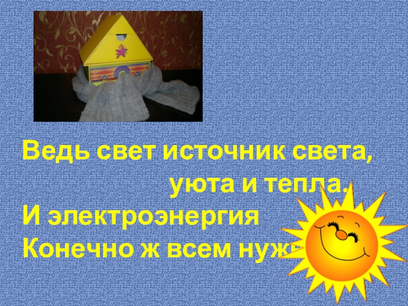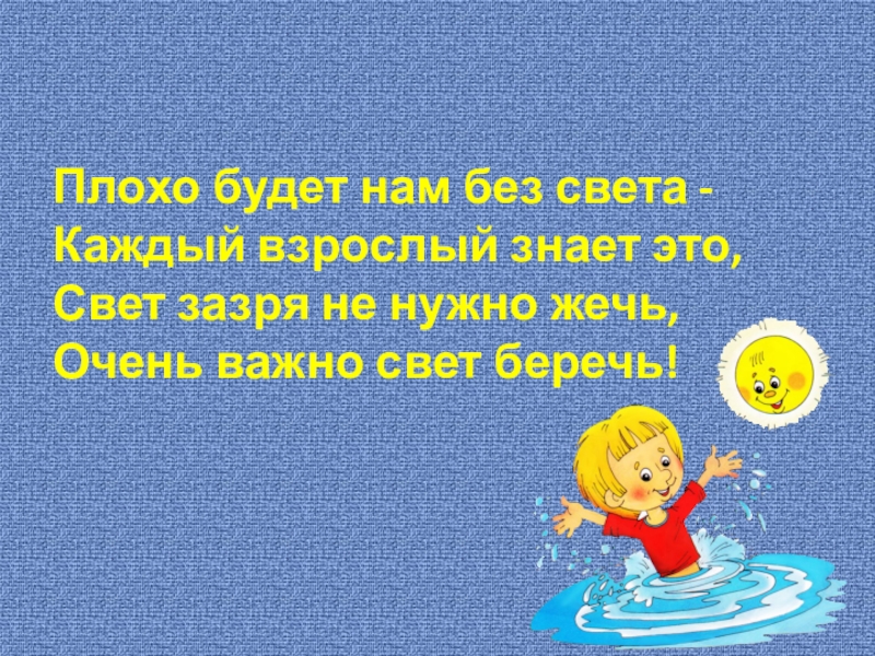 Плохо будет нам без света -Каждый взрослый знает это,Свет зазря не нужно жечь,Очень важно свет беречь!