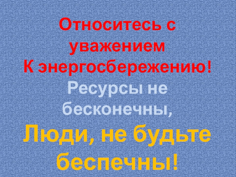 Относитесь с уважениемК энергосбережению!Ресурсы не бесконечны,Люди, не будьте беспечны!