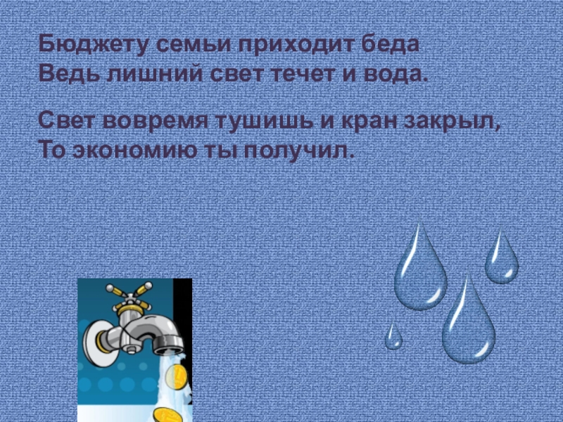 Бюджету семьи приходит бедаВедь лишний свет течет и вода.Свет вовремя тушишь и кран закрыл,То экономию ты получил.