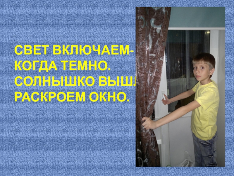 СВЕТ ВКЛЮЧАЕМ-КОГДА ТЕМНО.СОЛНЫШКО ВЫШЛО-РАСКРОЕМ ОКНО.