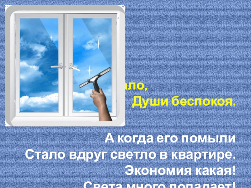 Оконное стеклоБыло никакое.Свет не пропускало,Души беспокоя. А когда его помылиСтало вдруг светло в квартире.Экономия какая!Света много попадает!