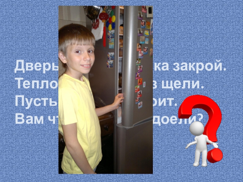 Дверь холодильника закрой.Тепло уходит через щели.Пусть закрытая стоит.Вам что, деньги надоели?