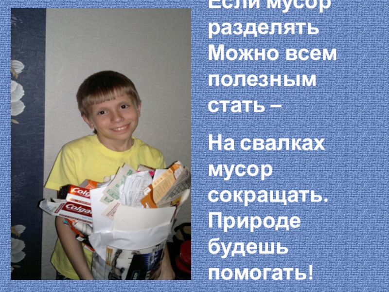 Если мусор разделятьМожно всем полезным стать – На свалках мусор сокращать.Природе будешь помогать!