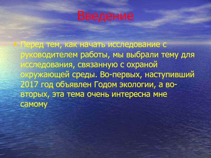 для исследования, связанную с охраной окружающей среды. Во-первых, наступивший 2017 год объявлен Годом экологии, а во-вторых, эта тема очень интересна мне самому