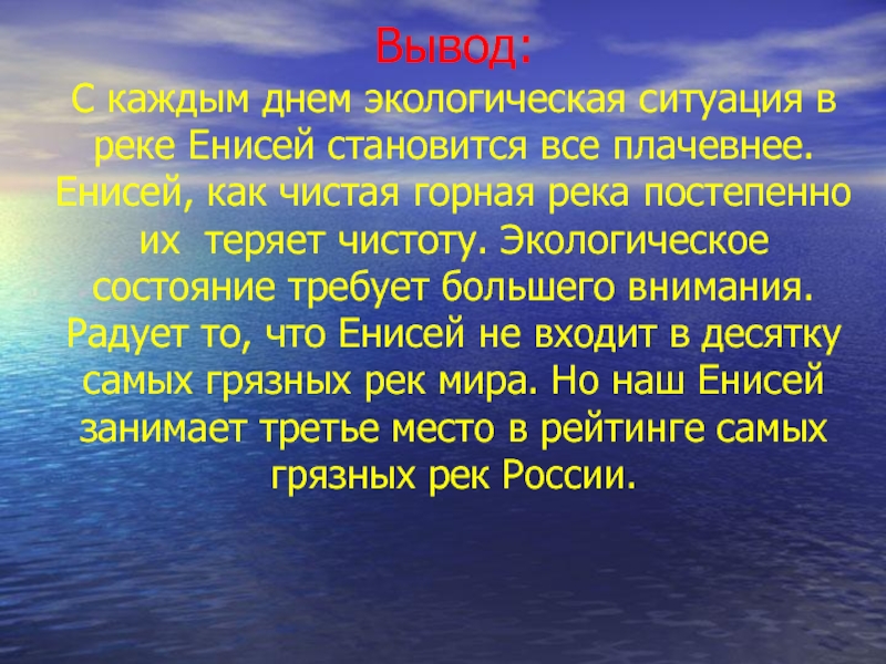 Енисей, как чистая горная река постепенно их теряет чистоту. Экологическое состояние требует большего внимания. Радует то, что Енисей не входит в десятку самых грязных рек мира. Но наш Енисей занимает третье место в рейтинге самых грязных рек России.