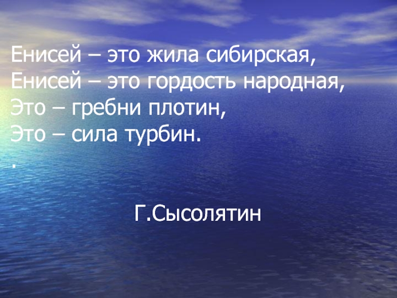 состояния Енисея, так как я живу в живописных берегах Енисея, в селе Ээрбек и река Ээрбек так же втекает в Енисей.