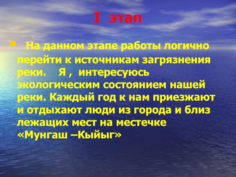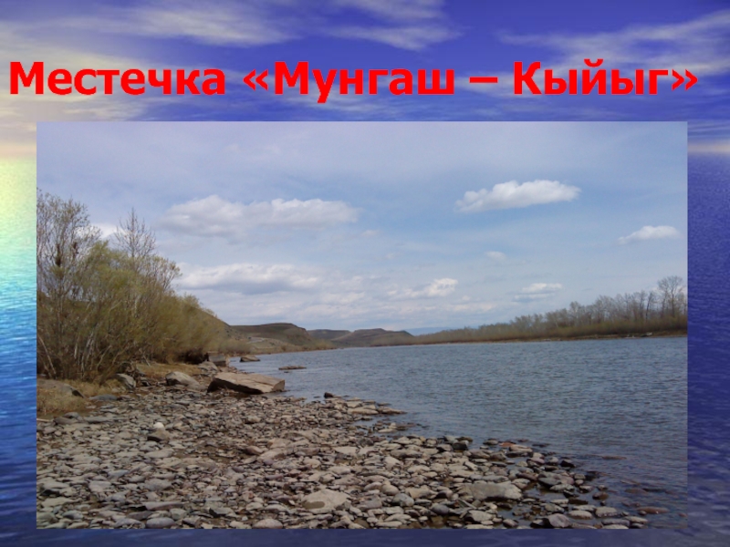 реки. Я , интересуюсь экологическим состоянием нашей реки. Каждый год к нам приезжают и отдыхают люди из города и близ лежащих мест на местечке «Мунгаш –Кыйыг»