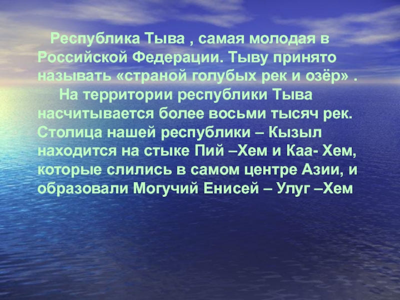На территории республики Тыва насчитывается более восьми тысяч рек. Столица нашей республики – Кызыл находится на стыке Пий –Хем и Каа- Хем, которые слились в самом центре Азии, и образовали Могучий Енисей – Улуг –Хем
