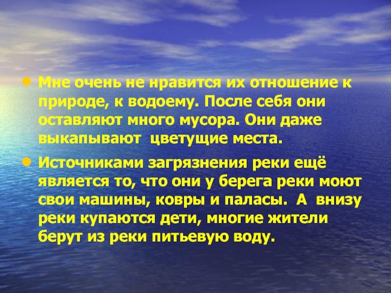 Слайд 16Мне очень не нравится их отношение к природе, к водоему. После