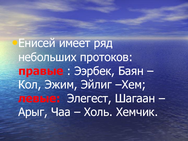 Слайд 12Енисей имеет ряд небольших протоков: правые : Ээрбек, Баян – Кол,