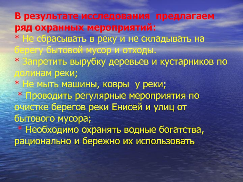 * Проводить регулярные мероприятия по очистке берегов реки Енисей и улиц от бытового мусора;