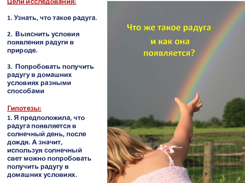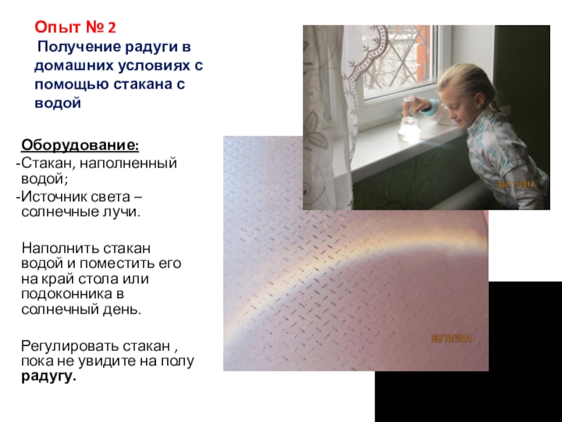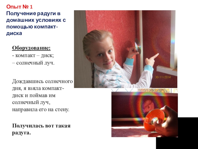 1. Я предположила, что радуга появляется в солнечный день, после дождя. А значит, используя солнечный свет можно попробовать получить радугу в домашних условиях.