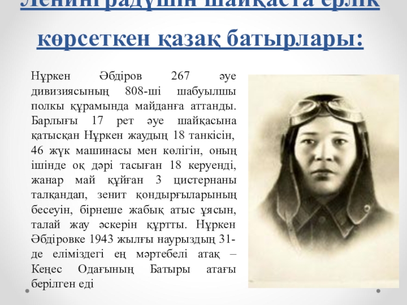 Слайд 7Ленинградүшін шайқаста ерлік көрсеткен қазақ батырлары: