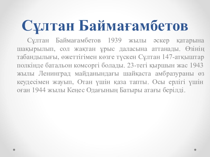 жақтан ұрыс даласына аттанады. Өзінің табандылығы, өжеттігімен көзге түскен Сұлтан 147-атқыштар полкінде батальон комсоргі болады. 23-тегі қыршын жас 1943 жылы Ленинград майданындағы шайқаста амбразураны өз кеудесімен жауып, Отан үшін қаза тапты. Осы ерлігі үшін оған 1944 жылы Кеңес Одағының Батыры атағы берілді.