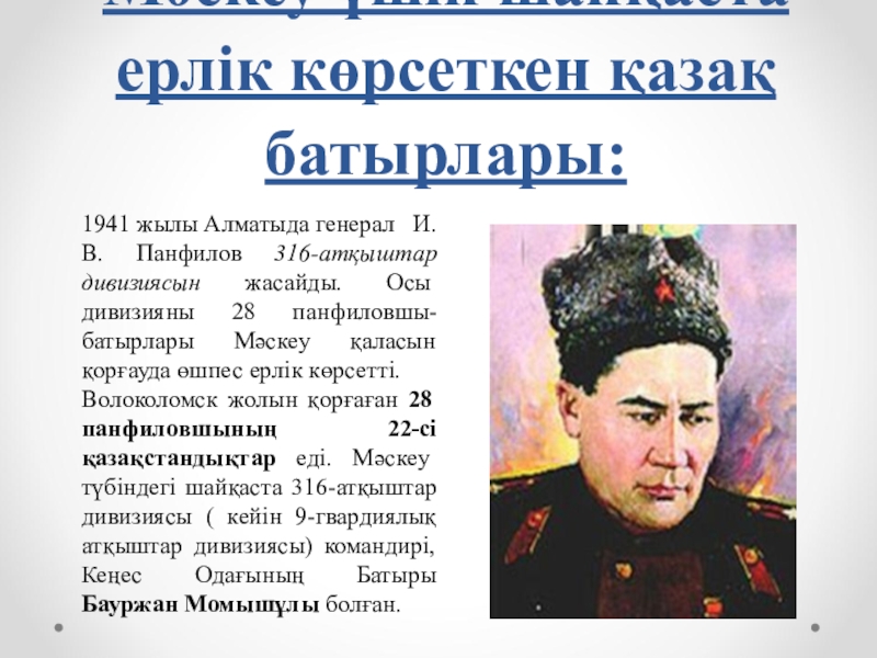 Слайд 4Мәскеу үшін шайқаста ерлік көрсеткен қазақ батырлары: