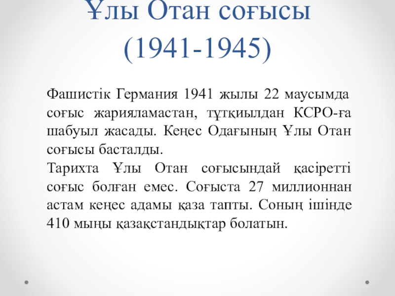 Тарихта Ұлы Отан соғысындай қасіретті соғыс болған емес. Соғыста 27 миллионнан астам кеңес адамы қаза тапты. Соның ішінде 410 мыңы қазақстандықтар болатын.
