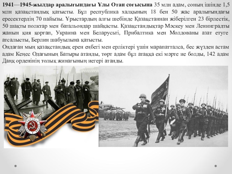 Слайд 141941—1945-жылдар аралығындағы Ұлы Отан соғысына 35 млн адам, соның ішінде 1,5