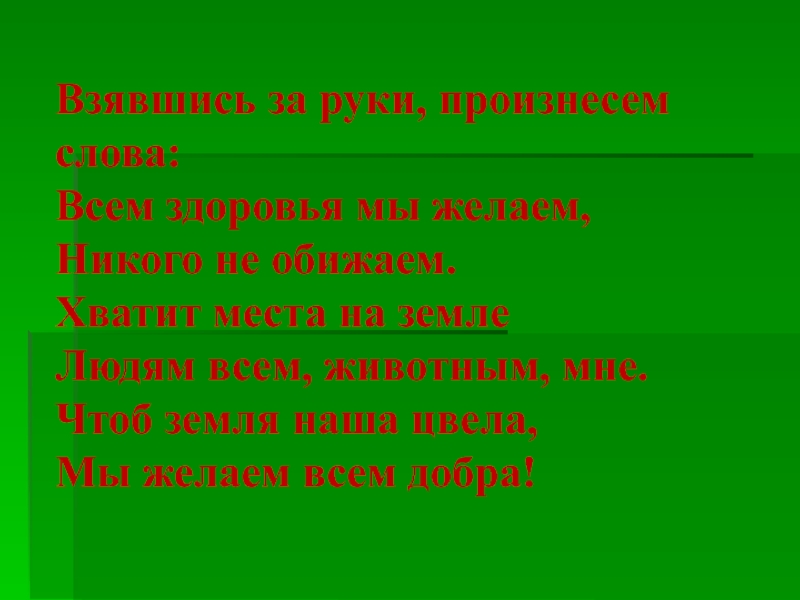Взявшись за руки, произнесем слова: Всем здоровья мы желаем, Никого не обижаем. Хватит места на земле Людям