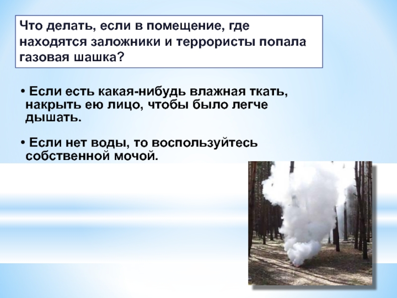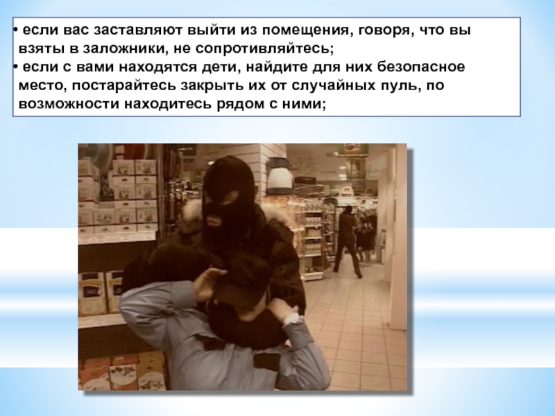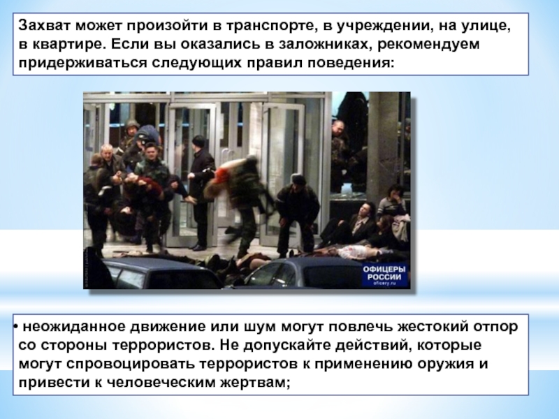 неожиданное движение или шум могут повлечь жестокий отпор со стороны террористов. Не допускайте действий, которые могут спровоцировать террористов к применению оружия и привести к человеческим жертвам;