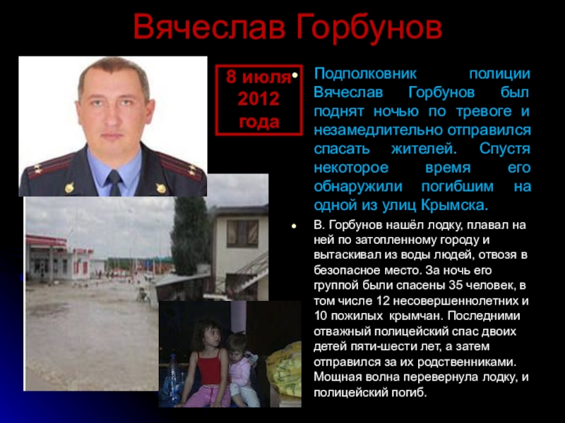 незамедлительно отправился спасать жителей. Спустя некоторое время его обнаружили погибшим на одной из улиц Крымска.