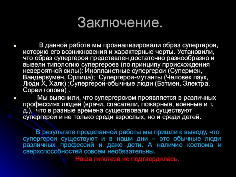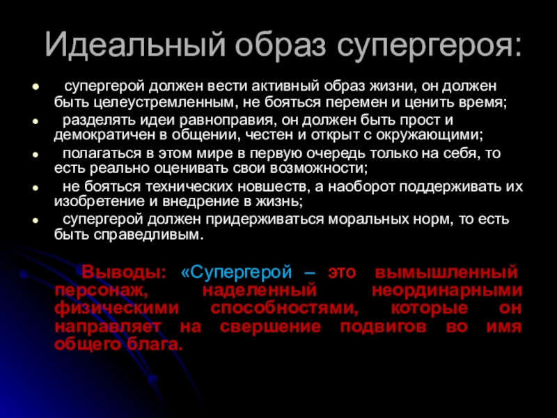 Выводы: «Супергерой – это вымышленный персонаж, наделенный неординарными физическими способностями, которые он направляет на свершение подвигов во имя общего блага.