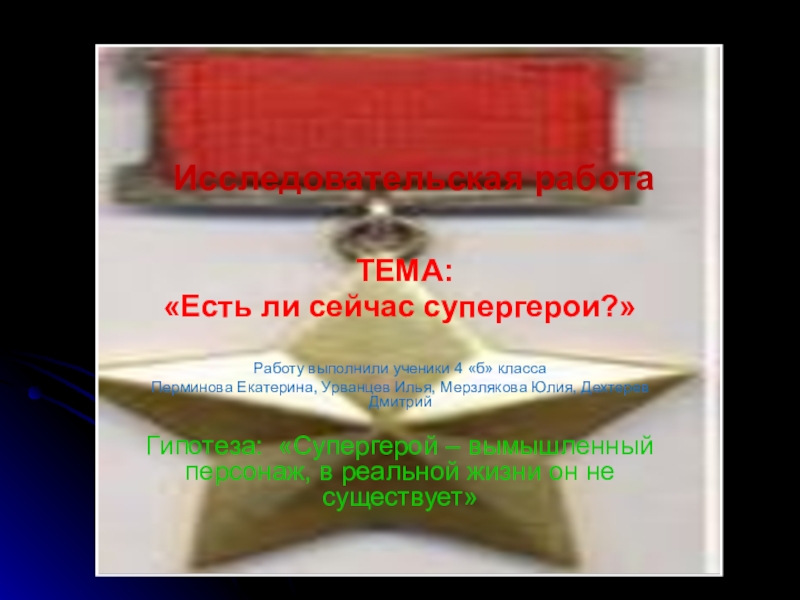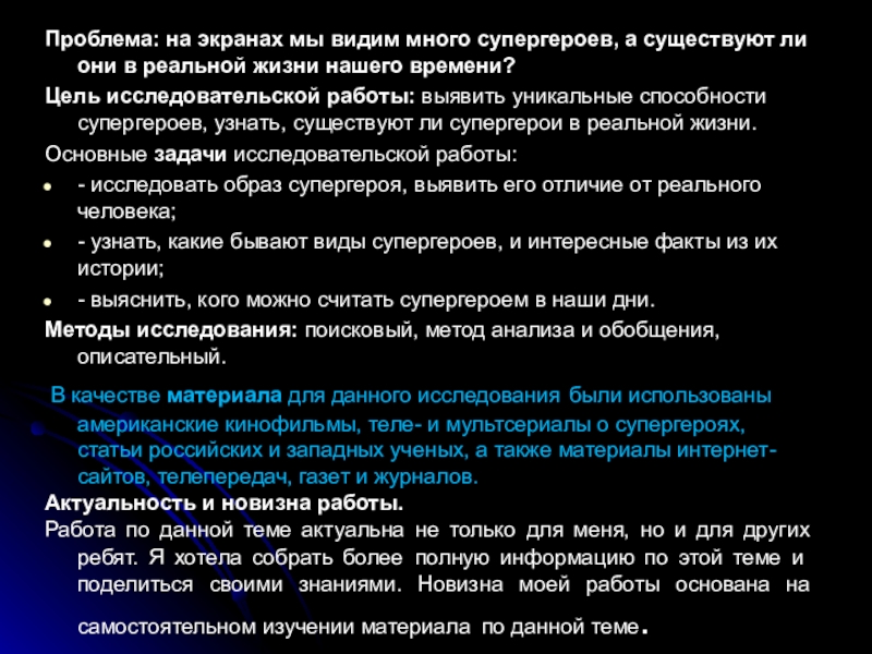 Цель исследовательской работы: выявить уникальные способности супергероев, узнать, существуют ли супергерои в реальной жизни.