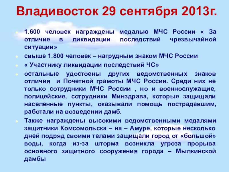 Также награждены высокими ведомственными медалями защитники Комсомольска – на – Амуре, которые несколько дней подряд своими телами защищали город от «большой» воды, когда из-за шторма возникла угроза прорыва основного защитного сооружения города – Мылкинской дамбы