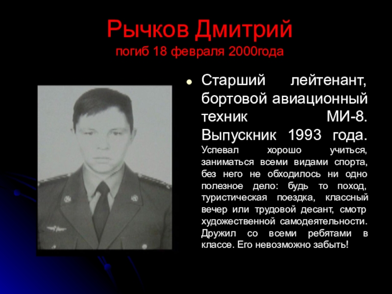 техник МИ-8. Выпускник 1993 года. Успевал хорошо учиться, заниматься всеми видами спорта, без него не обходилось ни одно полезное дело: будь то поход, туристическая поездка, классный вечер или трудовой десант, смотр художественной самодеятельности. Дружил со всеми ребятами в классе. Его невозможно забыть!