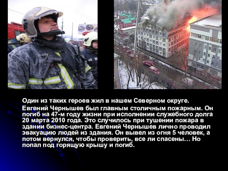 Евгений Чернышев был главным столичным пожарным. Он погиб на 47-м году жизни при исполнении служебного долга 20 марта 2010 года. Это случилось при тушении пожара в здании бизнес-центра. Евгений Чернышев лично проводил эвакуацию людей из здания. Он вывел из огня 5 человек, а потом вернулся, чтобы проверить, все ли спасены… Но попал под горящую крышу и погиб.