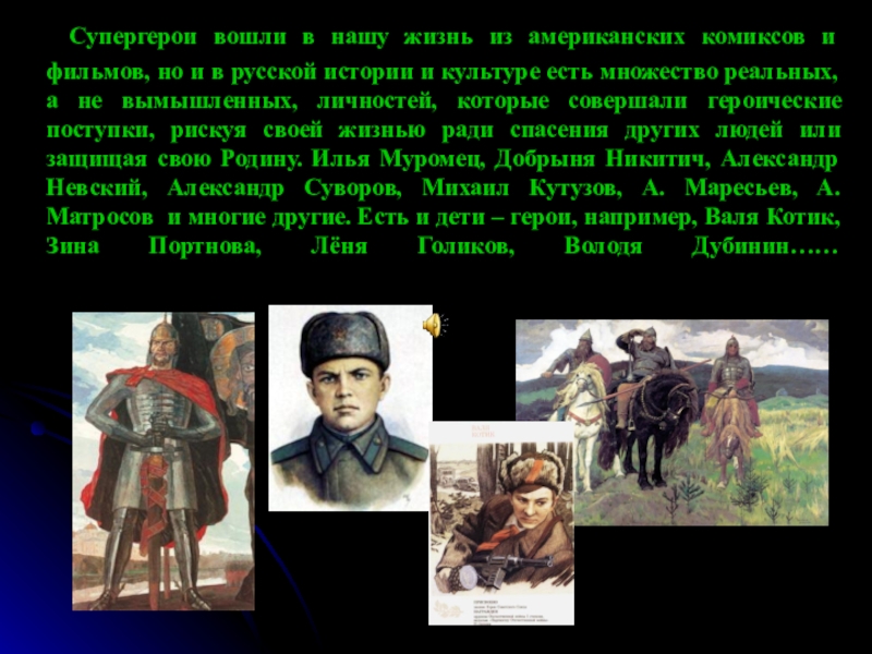но и в русской истории и культуре есть множество реальных, а не вымышленных, личностей, которые совершали героические поступки, рискуя своей жизнью ради спасения других людей или защищая свою Родину. Илья Муромец, Добрыня Никитич, Александр Невский, Александр Суворов, Михаил Кутузов, А. Маресьев, А. Матросов и многие другие. Есть и дети – герои, например, Валя Котик, Зина Портнова, Лёня Голиков, Володя Дубинин……