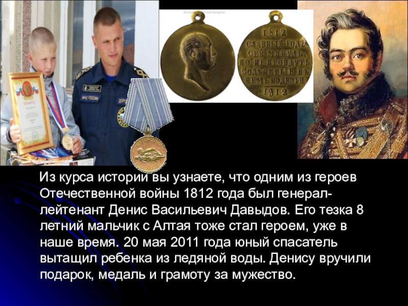 Отечественной войны 1812 года был генерал-лейтенант Денис Васильевич Давыдов. Его тезка 8 летний мальчик с Алтая тоже стал героем, уже в наше время. 20 мая 2011 года юный спасатель вытащил ребенка из ледяной воды. Денису вручили подарок, медаль и грамоту за мужество.