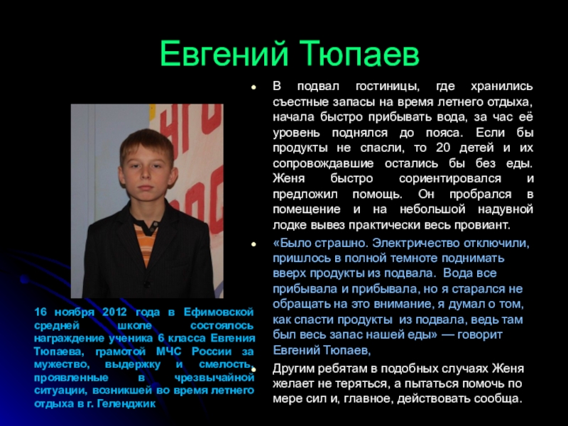 ученика 6 класса Евгения Тюпаева, грамотой МЧС России за мужество, выдержку и смелость, проявленные в чрезвычайной ситуации, возникшей во время летнего отдыха в г. Геленджик