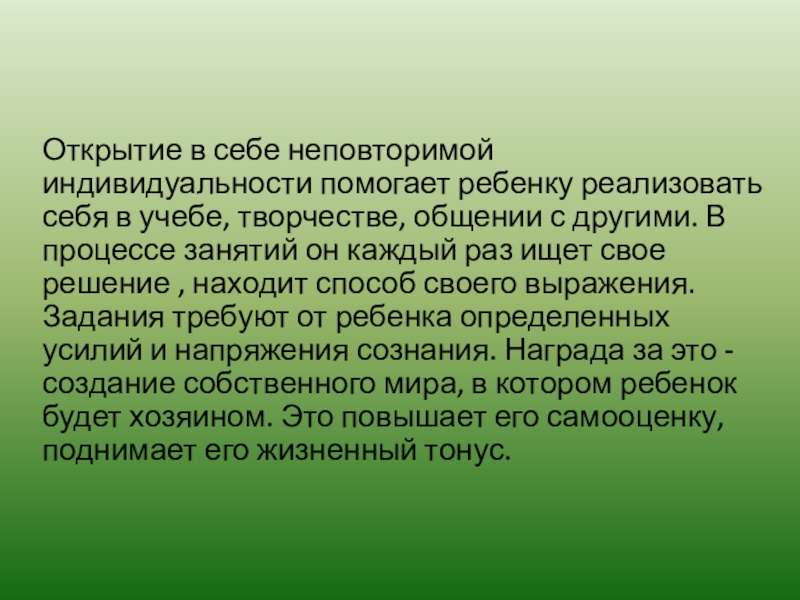 Слайд 12Открытие в себе неповторимой индивидуальности помогает ребенку реализовать себя в учебе,