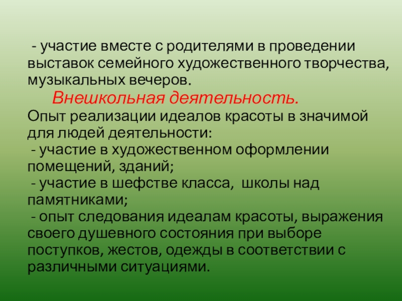 Слайд 8 - участие вместе с родителями в проведении выставок семейного художественного