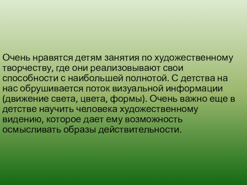 способности с наибольшей полнотой. С детства на нас обрушивается поток визуальной информации (движение света, цвета, формы). Очень важно еще в детстве научить человека художественному видению, которое дает ему возможность осмысливать образы действительности.