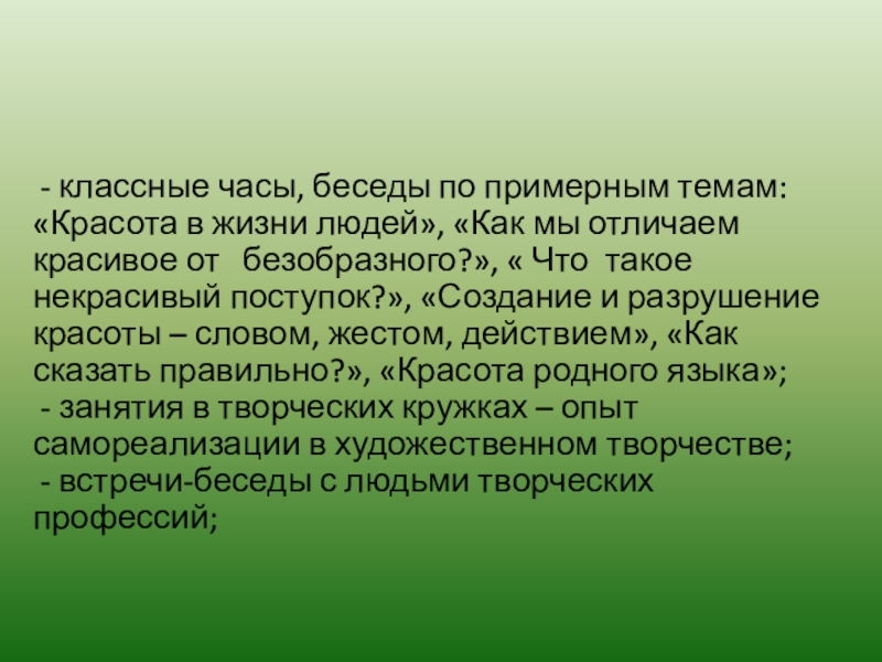 - классные часы, беседы по примерным темам: «Красота в жизни