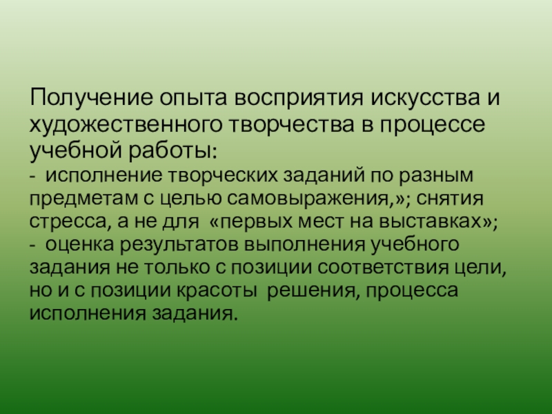 исполнение творческих заданий по разным предметам с целью самовыражения,»; снятия стресса, а не для «первых мест на выставках»;