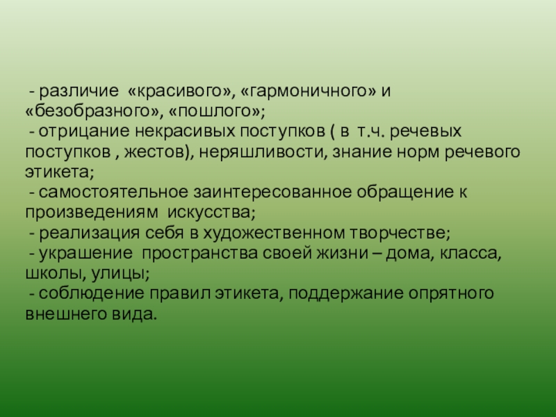 Слайд 10 - различие «красивого», «гармоничного» и «безобразного», «пошлого»;