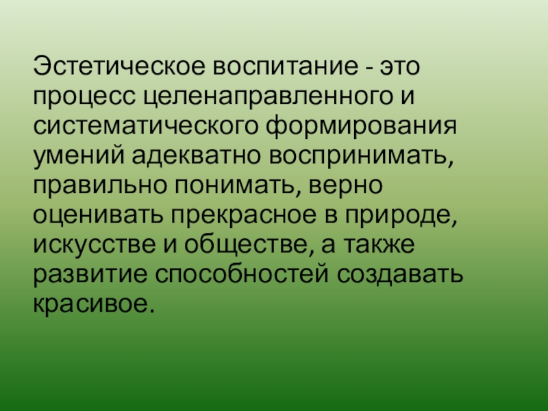 Слайд 3Эстетическое воспитание - это процесс целенаправленного и систематического формирования умений адекватно