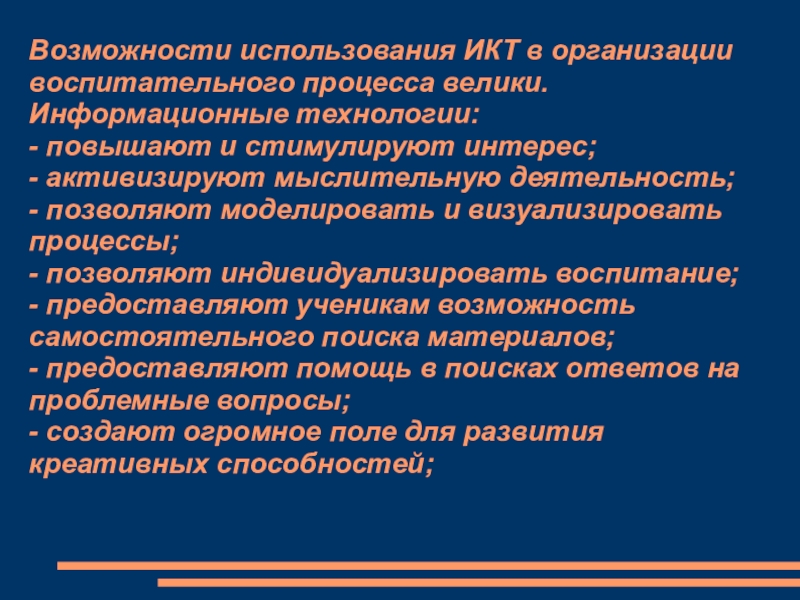 и стимулируют интерес; - активизируют мыслительную деятельность; - позволяют моделировать и визуализировать процессы; - позволяют индивидуализировать воспитание; - предоставляют ученикам возможность самостоятельного поиска материалов; - предоставляют помощь в поисках ответов на проблемные вопросы; - создают огромное поле для развития креативных способностей;