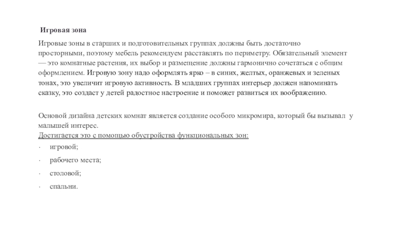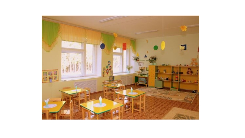 достаточно просторными, поэтому мебель рекомендуем расставлять по периметру. Обязательный элемент — это комнатные растения, их выбор и размещение должны гармонично сочетаться с общим оформлением. Игровую зону надо оформлять ярко – в синих, желтых, оранжевых и зеленых тонах, это увеличит игровую активность. В младших группах интерьер должен напоминать сказку, это создаст у детей радостное настроение и поможет развиться их воображению.