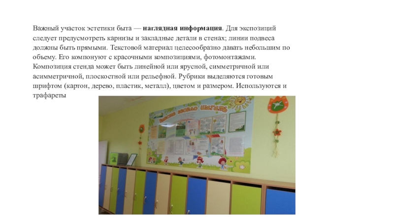 Слайд 9Важный участок эстетики быта — наглядная информация. Для экспозиций следует предусмотреть карнизы