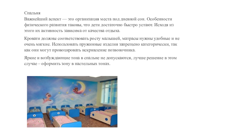 Кровати должны соответствовать росту малышей, матрасы нужны удобные и не очень мягкие. Использовать пружинные изделия запрещено категорически, так как они могут провоцировать искривление позвоночника.