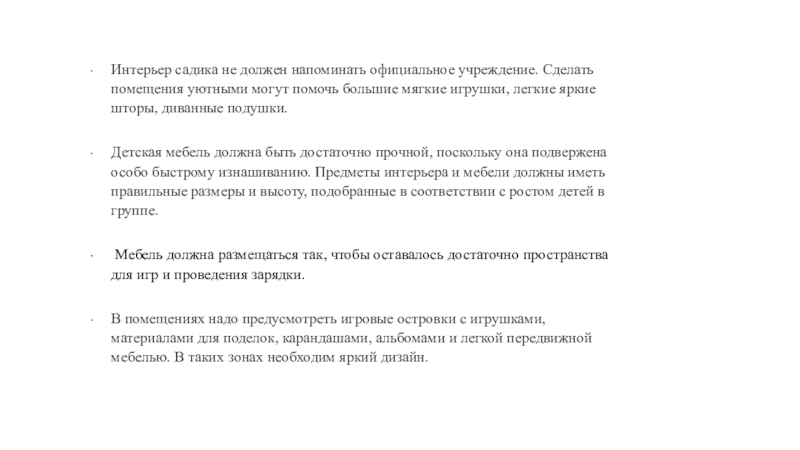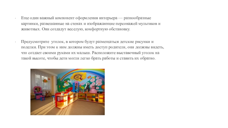 Слайд 5Интерьер садика не должен напоминать официальное учреждение. Сделать помещения уютными могут