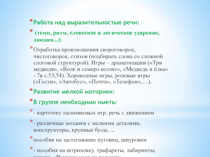 произношения скороговорок, чистоговорок, стихов (подбирать слова со сложной слоговой структурой). Игры – драматизации («Три медведя», «Волк и семеро козлят», «Медведь и ёлка» - 7в с.53,54). Хороводные игры, ролевые игры («Гости», «Автобус», «Почта», «Телефон»,…).